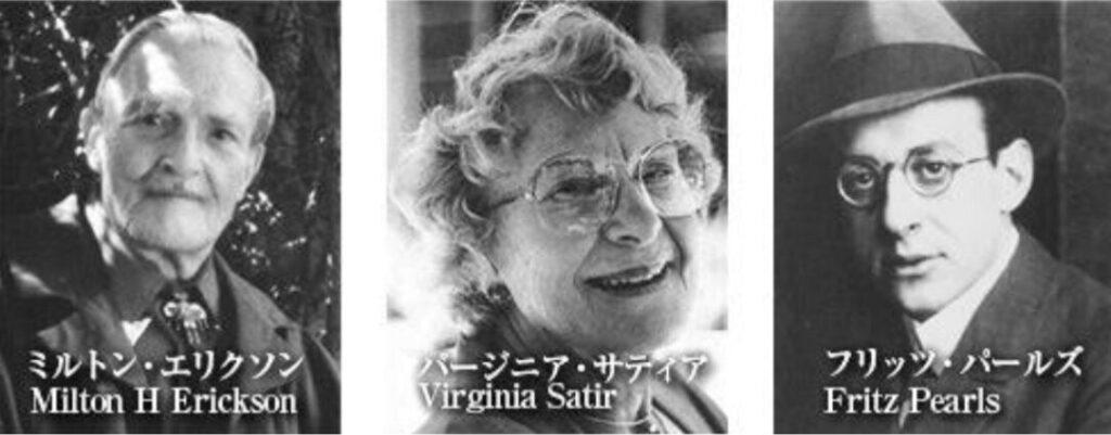 催眠療法家のミルトン・エリクソン、 家族療法のバージニア・サティア、 ゲシュタルト療法のフリッツ・パールズです。