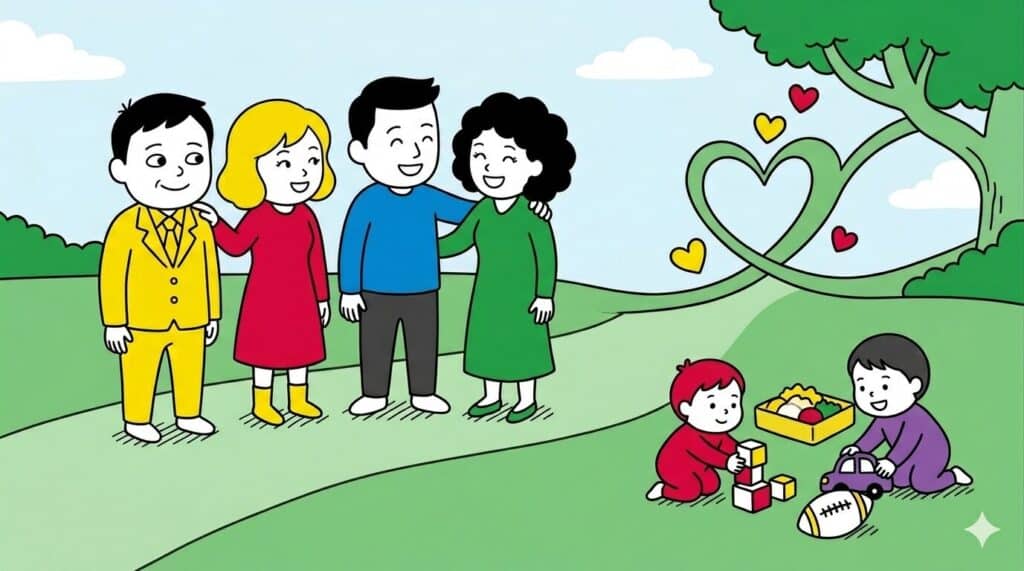 とは言っても、なかなか難しいと思うので、私がおすすめするアクションとしては、他の友人家族と一緒に時間を過ごしたり遊んだりすることです。どうしても子育てをしていると社会とのつながりが薄くなったり、他の人たちがどういうふうに子育てしているのかを実際に体験する機会がすごく少なくなります。積極的に他の友人たちと遊んで、その価値に触れたり話をするだけでもストレス発散になったりするので、ぜひ試してみてください。
